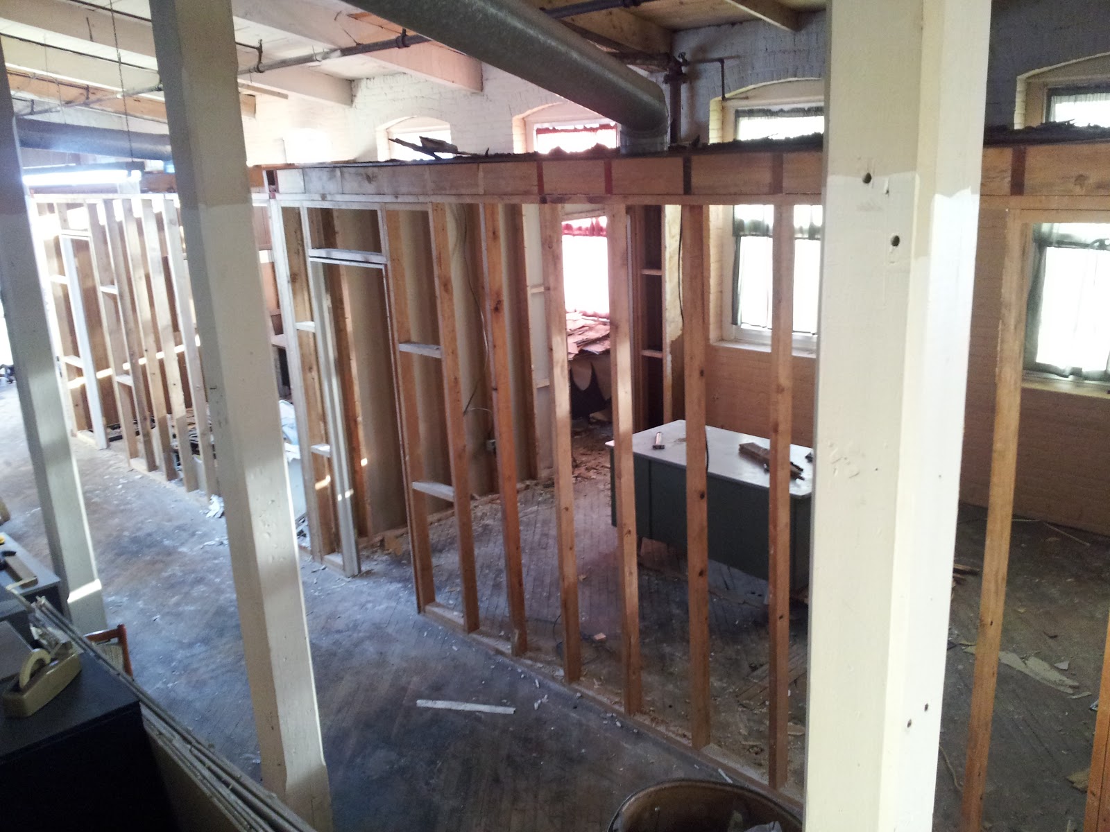 Tom has been taking down the office walls and has been making good progress. We're going to try to salvage some of the frame for other parts of the building, like the darkroom area.